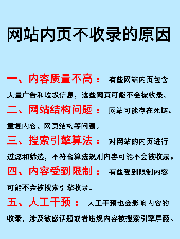 綜上所述,網(wǎng)站內(nèi)頁未獲收錄的原因多種多樣。為了提高網(wǎng)站內(nèi)頁的收錄率,我們建議網(wǎng)站管理員從優(yōu)化內(nèi)容質(zhì)量、改善網(wǎng)站結(jié)構(gòu)、遵循搜索引擎算法規(guī)則等方面著手,同時避免涉及違規(guī)或敏感內(nèi)容,以減少人工干預(yù)的影響。