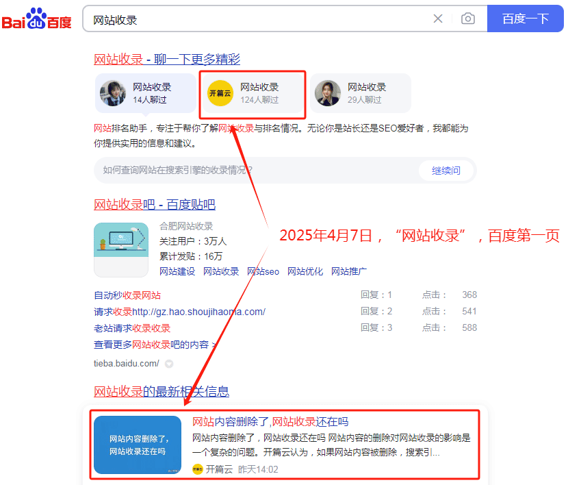 2025年4月7日,網(wǎng)站快速收錄排名百度第一頁,如果您有新網(wǎng)站需要網(wǎng)站快速收錄,需要百度快速收錄,需要360收錄,需要SEO優(yōu)化,需要關(guān)鍵詞優(yōu)化,可以聯(lián)系開篇云。