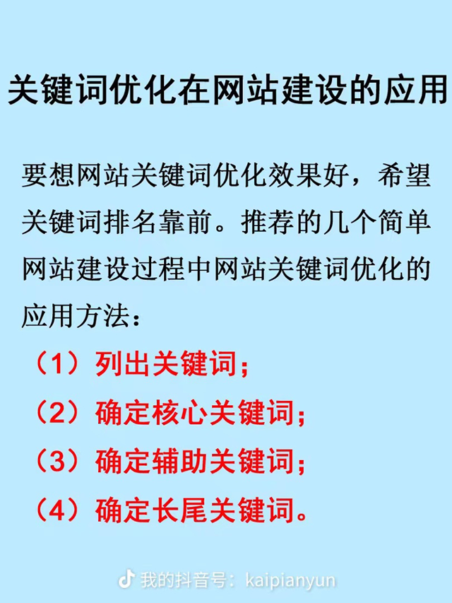 要想網站關鍵詞優化效果好,希望關鍵詞排名靠前,需要在網站建設過程中應用網站關鍵詞優化技術。推薦的幾個簡單網站建設過程 中網站關鍵詞優化的應用方法:(1)列出關鍵詞;(2)確定核心關鍵詞;(3)確定輔助關鍵詞;(4)確定長尾關鍵詞。