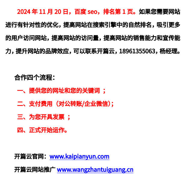 2024年11月20日,百度seo,關鍵詞排名百度第1頁。如果您需要百度seo,提高網站在百度關鍵詞排名,可以選擇開篇云。